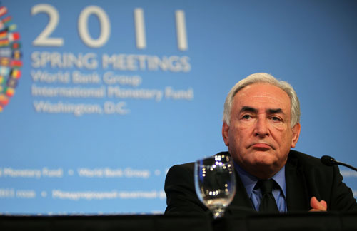 5月14日,國際貨幣基金組織(IMF)總裁多米尼克·斯特勞斯-卡恩因涉嫌對酒店女傭進行“性侵犯”在美國紐約被拘捕。 圖為4月14日,斯特勞斯-卡恩在美國首都華盛頓出席新聞發(fā)布會的資料照片。(記者
