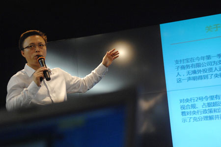6月14日,阿里巴巴董事局主席兼首席執(zhí)行官馬云就支付寶所有權(quán)變更事件在杭州舉行媒體溝通會(huì)。圖為支付寶副總裁井賢棟在媒體溝通會(huì)上介紹支付寶股權(quán)變更情況。記者
