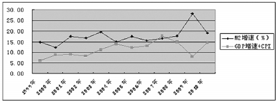 1、超額貨幣供給。從下圖可以看出,從1999年至今,中國(guó)的M2增速一直遠(yuǎn)高于“GDP增速+CPI增長(zhǎng)率”。2007年由于流動(dòng)性過(guò)剩帶來(lái)了股市和房地產(chǎn)的泡沫問(wèn)題,央行屢次提高存款準(zhǔn)備金率和利率,并配合央票等手段加大回收流動(dòng)性。但在2008年以后,貨幣政策轉(zhuǎn)向?qū)捤,超額貨幣的發(fā)行呈現(xiàn)喇叭口形的放大,到2009年達(dá)到了一個(gè)高點(diǎn)。2010年因經(jīng)濟(jì)增長(zhǎng)速度提高并且通貨膨脹率上升,二者差距有所縮小。