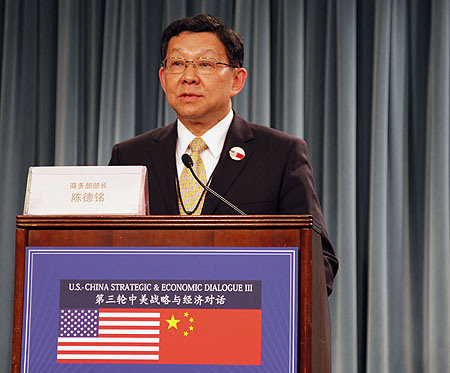 2011年5月9日,在美國(guó)首都華盛頓,中國(guó)商務(wù)部部長(zhǎng)陳德銘在第三輪中美戰(zhàn)略與經(jīng)濟(jì)對(duì)話舉行期間召開新聞發(fā)布會(huì)。 陳德銘呼吁美國(guó)放寬對(duì)華出口限制,并為中國(guó)企業(yè)赴美投資創(chuàng)造良好的環(huán)境。資料照片 |