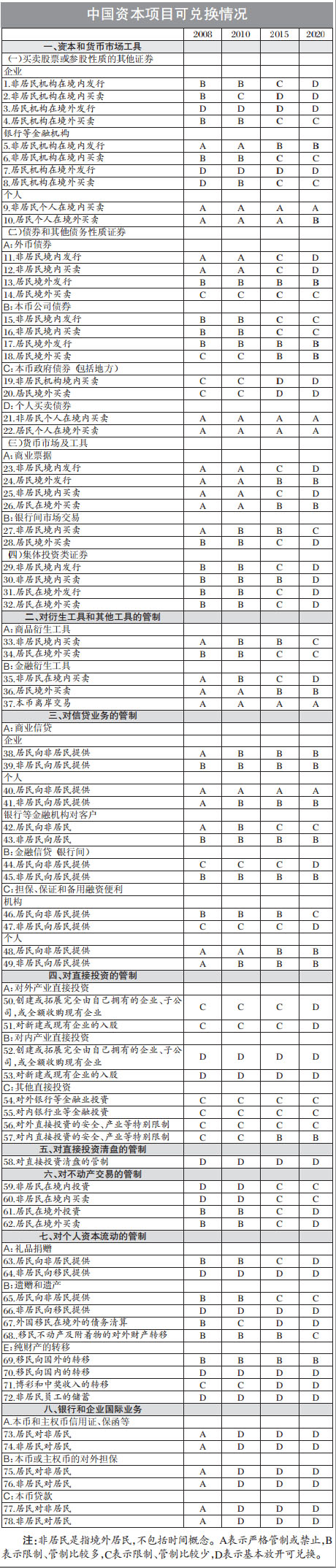 如果我們把可兌換劃分為:A表示嚴(yán)格管制或禁止,B表示限制、管制比較多,C表示限制、管制比較少,D表示基本放開(kāi)可兌換。那么,78項(xiàng)中,個(gè)人在境內(nèi)外買(mǎi)賣(mài)債券、非居民境內(nèi)發(fā)行和買(mǎi)賣(mài)外幣債券、政府債券、本幣離岸交易、個(gè)人擔(dān)保等放款、本幣國(guó)際業(yè)務(wù)等,合計(jì)有28個(gè)項(xiàng)目應(yīng)完全禁止或管制嚴(yán)格;限制和管制比較多的有25項(xiàng);限制和管制比較少的有13項(xiàng);基本放開(kāi)可兌換的有12項(xiàng)。基本放開(kāi)和完全放開(kāi)的合計(jì)25項(xiàng),占全部可兌換項(xiàng)目的比例32%,大體上可以說(shuō),我國(guó)資本項(xiàng)目基本可兌換和完全可兌換的只有1/3。