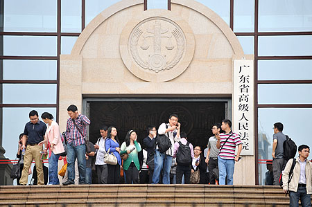 奇虎與騰訊的兩項訴訟,使法律得到一個對3Q之戰(zhàn)進行梳理的機會。圖為4月18日參加奇虎訴騰訊一案庭審的人員在庭審后走出廣東省高院。記者