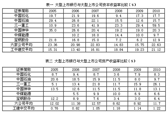 表一、表二中選擇了工中建交四家國有上市銀行和六家實體經(jīng)濟上市公司,縱向分析它們在2005-2010年期間的效益增長情況。其數(shù)據(jù)對比說明,六家實體經(jīng)濟公司不僅平均資產(chǎn)收益率遠遠高于四家國有銀行的平均水平,而且其平均資本收益率在其中的四年內(nèi)也高于四家國有銀行的平均水平。所不同的是,四家國有銀行的平均資本收益率與資產(chǎn)收益率在六年中呈逐年上升的趨勢,而六家實體經(jīng)濟公司中,除“三一重工”與“中國神華”外,其他四家的資本收益率與資產(chǎn)收益率均呈現(xiàn)波動明顯、逐年下降的趨勢。