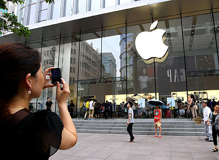 我們艷羨蘋果,但蘋果的魅力和威力是建立在雄厚的知識產(chǎn)權(quán)資產(chǎn)之上的。蘋果公司擁有260件以上的商標,僅2011年在美國就申請了676件專利。圖為7月12日,游客在上海南京路上的蘋果專賣店前拍照。記者 陳飛 攝 |