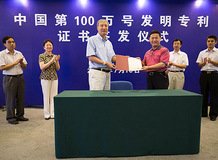 7月16日,國家知識產(chǎn)權(quán)局局長田力普(左三)向發(fā)明專利權(quán)利人北京農(nóng)業(yè)信息技術(shù)研究中心的負責人頒發(fā)證書。此次簽發(fā)的第100萬號授權(quán)發(fā)明專利名稱為“一種虛擬玉米葉片模型可控面元劃分方法”。自1985年授權(quán)首件發(fā)明專利以來,至今年7月11日,我國27年時間里發(fā)明專利累計授權(quán)量達到100萬件,成為世界上達到這個目標耗時最短的國家。但是,我們的專利擁有總量、國民人均擁有量、專利轉(zhuǎn)化率,還遠遠落后于許多領(lǐng)先的創(chuàng)新性國家。記者 金立旺 攝 |