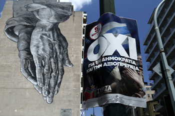 當(dāng)?shù)貢r(shí)間7月1日,希臘雅典,隨著希臘債務(wù)危機(jī)的不斷升級(jí),全民公投即將進(jìn)行,反對(duì)公投的民眾在雅典財(cái)政部大樓前掛起了反公投退歐的宣傳旗幟,反對(duì)即將到來的全民公投。 |