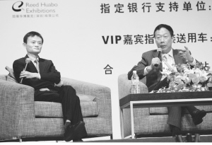 | 馬云與臺(tái)灣鴻海集團(tuán)董事長(zhǎng)郭臺(tái)銘在網(wǎng)商大會(huì)上對(duì)話(huà)。IC圖片 | 轉(zhuǎn)型綜合交易平臺(tái)