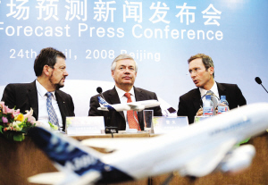 | 4月24日,空中客車公司客戶事務(wù)首席運(yùn)營官雷義(中)、空中客車公司市場(chǎng)預(yù)測(cè)與研究副總裁勞倫·羅奧(右)和空中客車中國公司總裁博龍?jiān)?007—2026年全球航空市場(chǎng)(中國)預(yù)測(cè)發(fā)布會(huì)上。