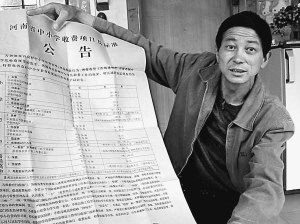 圖為沙振明在展示《河南省中小學(xué)收費項目及標(biāo)準(zhǔn)公告》。曲昌榮 攝