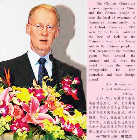 “北京奧運(yùn)會(huì)上,中芬兩國(guó)健兒可能在一些項(xiàng)目上同場(chǎng)競(jìng)技,這里,我愿給中國(guó)運(yùn)動(dòng)員提個(gè)醒,在和我們的運(yùn)動(dòng)員對(duì)陣的時(shí)候,千萬不要因開始時(shí)取得優(yōu)勢(shì),就以為勝券在握,要小心芬蘭運(yùn)動(dòng)員后發(fā)制人,要知道他們以有耐力著稱!