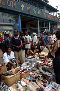 在喀麥隆經(jīng)濟首都杜阿拉的中國商城,當(dāng)?shù)匦∝溤谑圪u中國商品。本報記者 楊磊