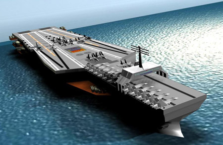 | 網(wǎng)友設(shè)計的中國海軍航母想象圖。 | 【中央軍委委員、海軍司令員吳勝利上將日前在接受新華網(wǎng)采訪時透露,中國海軍將研制新一代艦艇飛機。要進一步加大裝備的現(xiàn)代技術(shù)含量,必須加快推進重點武器裝備建設(shè)步伐,研制大型水面戰(zhàn)斗艦艇等新一代武器裝備。此前,中國國防部長梁光烈2009年3月20日與到訪的日本防衛(wèi)大臣濱田靖一會談時表示,中國是唯一沒有航母的大國,中國不可能永遠(yuǎn)不擁有航母。這樣的表態(tài)被海外媒體解讀成是中國政府首次公開宣布航母建造計劃。據(jù)有關(guān)專家估算,如果中國建造一艘自用的航空母艦,并為其配備完整的戰(zhàn)斗編隊,恐將花費上百億元。在當(dāng)前這個國際經(jīng)濟不振、國內(nèi)經(jīng)濟面臨考驗的時候,上百億元的采購大單,毫無疑問會對中國經(jīng)濟起到助推和加速作用!