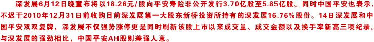 中國平安: 深發(fā)展品牌目前不會有任何改變 深發(fā)展將來會不會被整合到中國平安之中而導致退市,成為此次收購案的最大懸念之一。對此,雙方均表示討論這個問題為時過早,尚沒有明確計劃以及時間表來處理平安銀行和深發(fā)展的整合。[詳細] |