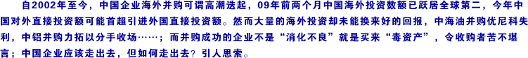 價值從歷史高點(diǎn)下跌了約40%,但同期中國企業(yè)的國內(nèi)并購交易額卻增長了約10%。 中國國內(nèi)并購活動持續(xù)增長的原因有二。第一,政府主導(dǎo)了很多國有企業(yè)為龍頭的行業(yè)整合。當(dāng)前的經(jīng)濟(jì)困難正讓政府有機(jī)會促成一些過去可能受到抵制的整合交易。第二,資產(chǎn)負(fù)債狀況良好的中國企業(yè)抓住機(jī)遇收購實(shí)力較弱的本地企業(yè)。與2008年國內(nèi)并購交易的紅火相比,中國企業(yè)在國外的并購清淡了許多。[詳細(xì)] | | | |