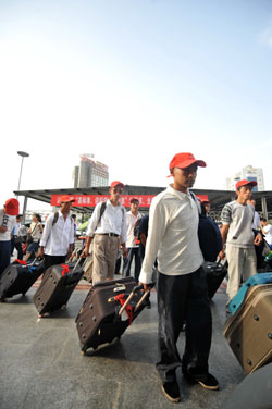 甘肅臨夏組織勞務(wù)人員赴海外“淘金”,圖為臨夏州勞務(wù)人員走進(jìn)蘭州火車站。新華社記者:聶建江