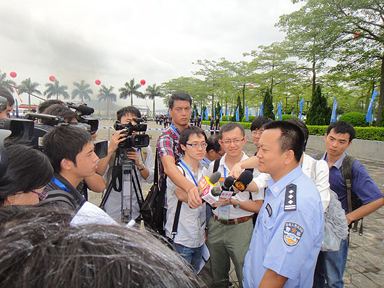 | 海關(guān)總署25日上午在廣東虎門舉行儀式,銷毀全國(guó)海關(guān)近年來(lái)查獲的上噸走私毒品。圖為海關(guān)辦案發(fā)言人在接受記者采訪。 |