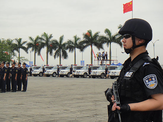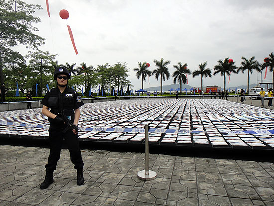 | 海關(guān)總署25日上午在廣東虎門舉行儀式,銷毀全國(guó)海關(guān)近年來(lái)查獲的上噸走私毒品。圖為現(xiàn)場(chǎng)四周警察嚴(yán)陣以待。 |