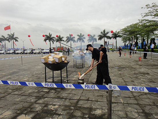 | 海關(guān)總署25日上午在廣東虎門舉行儀式,銷毀全國(guó)海關(guān)近年來(lái)查獲的上噸走私毒品。圖為現(xiàn)場(chǎng)準(zhǔn)備銷毀的海洛因。 |
