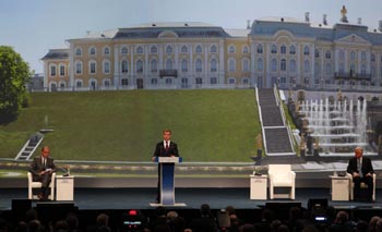 6月18日,第14屆圣彼得堡國際經(jīng)濟論壇開幕。當(dāng)天,俄總統(tǒng)梅德韋杰夫致辭。(新華社發(fā)) |
