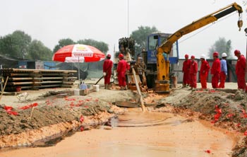 塔輪天然氣管道復線成功穿越中國最長內(nèi)陸河。施工人員正在現(xiàn)場作業(yè)(8月8日攝)。新華社發(fā)(陳士兵
