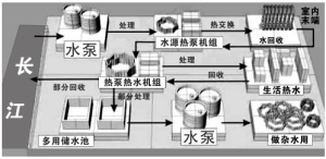| “江水空調(diào)”工作原理示意圖 劉小青制作 | 用電力將江水匯集到熱泵中轉換,使之形成一種空調(diào)系統(tǒng),俗稱“水空調(diào)”。 重慶市“十一五”期間計劃完成200萬平方米的“水空調(diào)”示范工程,首選大型酒店、公共建筑,然后逐步向市民住房普及。 本報重慶12月6日電