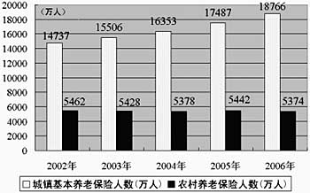 目前,養(yǎng)老保險已經(jīng)實(shí)現(xiàn)廣覆蓋。到2006年底,全國基本養(yǎng)老保險參保人數(shù)為18766萬人,城鎮(zhèn)參加企業(yè)基本養(yǎng)老保險覆蓋率達(dá)到76%。而且,基本養(yǎng)老金正常調(diào)整機(jī)制建立了起來。1998—2005年,企業(yè)參保離退休人員人均養(yǎng)老金水平由每月413元增加到719元,年均增長8.2%。2006年,中央決定較大幅度地提高企業(yè)退休人員基本養(yǎng)老金,當(dāng)年月人均養(yǎng)老金達(dá)到815元。另外,統(tǒng)籌層次正逐步穩(wěn)定提高。截至2006年底,全國已有北京、天津、吉林、黑龍江、上海、福建、重慶、云南、陜西、甘肅、青海、寧夏、新疆13個省區(qū)市實(shí)現(xiàn)了省級統(tǒng)籌。但是,農(nóng)村養(yǎng)老保險的推進(jìn)比較緩慢,覆蓋面還比較小。