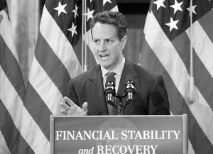 | 10日,美財(cái)長蓋特納在財(cái)政部宣布新的金融救援計(jì)劃。新華社/路透 | 與上任前的咄咄逼人相比,奧巴馬政府在對(duì)人民幣匯率問題上的立場正悄悄作出調(diào)整。在本周二的一次電視采訪中,新上任的美國財(cái)長蓋特納坦言,政府尚未對(duì)中國是否“操縱匯率”作出最終判斷,并稱在此事上當(dāng)局會(huì)“小心行事”。這與他上月在國會(huì)大談“人民幣匯率操縱”的立場形成鮮明對(duì)照。不僅如此,上任不過三周的蓋特納已兩次致電中國國務(wù)院副總理王岐山,強(qiáng)調(diào)兩國繼續(xù)保持密切對(duì)話“尤其重要”。