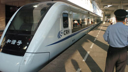 4月18日,中國鐵路第六次提速啟動(dòng),11組65對D字頭列車行駛在廣深線上,其中直達(dá)D字頭列車7對,全程僅需52分鐘。廣州至深圳每天有85趟列車以每十分鐘一趟的頻率營運(yùn),使這兩個(gè)相距147公里的城市真正進(jìn)入一小時(shí)生活圈。圖為在廣州火車東站,一列“和諧號”高速列車準(zhǔn)備出發(fā)開往深圳。 |