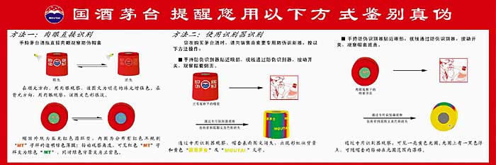 以上極為特別的防假防偽技術(shù)集中于茅臺酒包裝的酒瓶膠帽和防偽標(biāo)簽之上,體現(xiàn)了當(dāng)今國際上先進(jìn)的高科技水平,凸顯出“人無我有,人有我精”的“三化”、“三防”功能(即:“人性化設(shè)計”、“差異化優(yōu)勢”、“一體化功能”,以及防偽、防剪、防回收)。