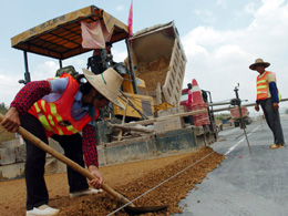 南寧至百色高速公路是國家規(guī)劃的“五縱七橫”國道主干線衡陽至昆明主干線在廣西境內的一段,是我國貫通中西部地區(qū)的重要通道之一,也是云、貴、川等省通往廣西沿海港口和粵港澳地區(qū)最便捷的出海通道,預計2007年12月28日建成通車。圖為建筑工人在鋪設路面。