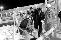 寧波檢驗檢疫局工作人員在大榭口岸進行進口原油鑒定 |