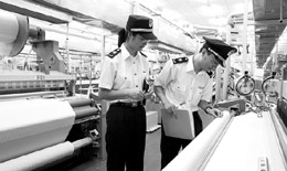 寧波檢驗檢疫局工作人員在雅戈爾集團有限公司生產(chǎn)車間檢驗出口紡織品 |