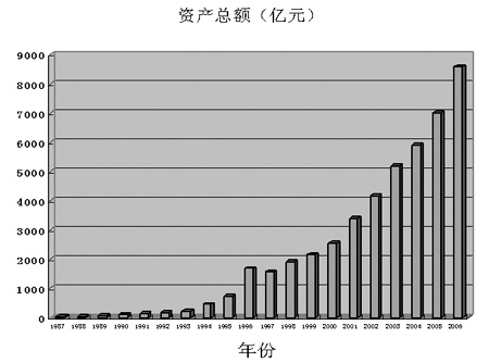 2006年底,全國(guó)財(cái)務(wù)公司資產(chǎn)規(guī)模為8581億元,較1987年的17億元增長(zhǎng)了504倍。(見(jiàn)圖一)