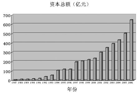 2006年底,全國(guó)財(cái)務(wù)公司資本總額為647億元,較1987年的2億元增長(zhǎng)了323倍。(見(jiàn)圖二)