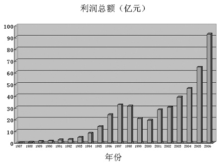 2006年,全國(guó)財(cái)務(wù)公司實(shí)現(xiàn)利潤(rùn)總額93億元,較1987年的341萬(wàn)元增長(zhǎng)了2300倍。(見(jiàn)圖三)