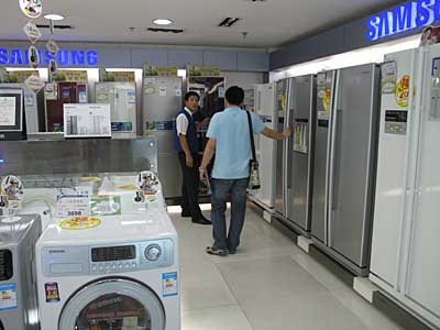 十一黃金周前后,三星家電最新產品盛裝上陣,在北京、上海、沈陽、廣州等地啟動主題為“三星到我家 美夢即成真”的大型促銷活動;顒拥闹鞔蛏唐钒∟8系列全高清液晶電視、“赫慕”雙開門冰箱、熱風清新洗衣機、安德烈·金空調等。據悉,在活動期間,消費者購買三星家電產品,可獲得豐富多樣的優(yōu)惠。圖為北京一賣場。