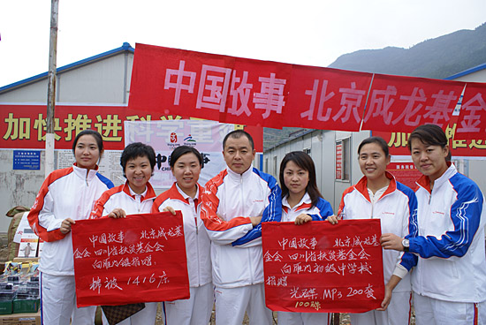 4016床棉被、1700套MP3和300張成龍奧運(yùn)專輯CD,這批由北京奧組委“中國故事”核心運(yùn)行團(tuán)隊、北京成龍慈善基金會,聯(lián)合四川省扶貧基金會捐贈的慈善物資,于10月25日被送往綿陽市長虹集團(tuán)培訓(xùn)基地的北川中學(xué)、江油雁門鎮(zhèn)中學(xué)和劍閣縣政府。 據(jù)“中國故事”核心運(yùn)行團(tuán)隊工作人員介紹,在奧運(yùn)會舉辦前期,就曾邀請北川中學(xué)的部分師生前往北京參觀鳥巢、水立方以及參與奧運(yùn)文化活動,當(dāng)時他們與孩子們約定,奧運(yùn)會結(jié)束后,一定來四川看望他們。4016床棉被是2008的兩倍數(shù),象征著2008年北京奧運(yùn)和2008年北京殘奧會對四川地震災(zāi)區(qū)的關(guān)懷和援助。此次捐給災(zāi)區(qū)的物資費(fèi)用全部由成龍慈善基金會承擔(dān)。