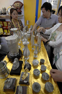 11月2日,參觀者在南寧舉行的第三屆中國-東盟博覽會上挑選馬來西亞錫器。
