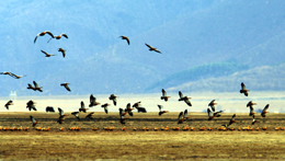 三江并流世界自然遺產(chǎn)地,位于云南省西北部橫斷山脈的金沙江、瀾滄江和怒江流域的特定自然地理區(qū)域,是世界上罕見的集地質(zhì)地貌多樣性、動(dòng)植物多樣性、景觀多樣性及民族文化多樣性于一體的高山峽谷自然區(qū)域。為保護(hù)當(dāng)?shù)厣鷳B(tài)環(huán)境,云南省先后劃定了白馬雪山、玉龍雪山等10余個(gè)國家和省級(jí)自然保護(hù)區(qū),并投入巨資實(shí)施天然林保護(hù)工程和水土保持工程。目前,這一區(qū)域林草豐茂,美景如畫。圖為鳥類在云南省迪慶藏族自治州香格里拉縣境內(nèi)的納帕海自然保護(hù)區(qū)內(nèi)飛翔。 |