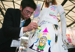 2006中國(guó)國(guó)際文具及辦公用品展覽會(huì)日前在上海開(kāi)幕。來(lái)自中國(guó)、奧地利、比利時(shí)、法國(guó)、德國(guó)等22個(gè)國(guó)家和地區(qū)的500余家企業(yè)參展。圖為一位工作人員展示可以在衣服上進(jìn)行彩繪的專用筆。