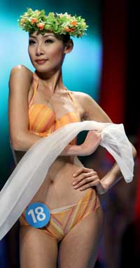 參加中國內(nèi)衣模特大賽的18號選手景麗在比賽中。