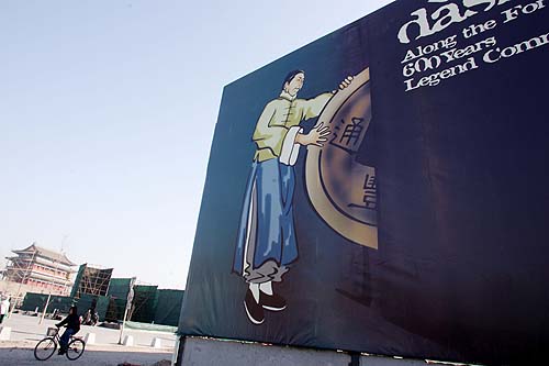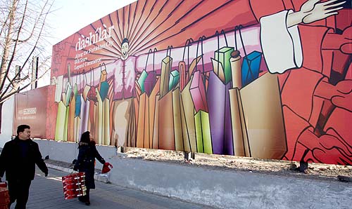 一批富有老北京韻味的商業(yè)風(fēng)情畫日前出現(xiàn)在北京前門大柵欄商業(yè)區(qū)改造工地的圍擋上,吸引了過往行人的眼球。