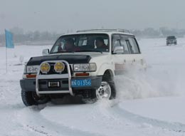 2006年12月22日,黑龍江冰上汽車?yán)愒谶M(jìn)行中。當(dāng)天,2006黑龍江冰上汽車?yán)愒谖覈诤佣蔚暮邶埥嫔吓e行,來自國內(nèi)各地的13輛越野型車輛參加了比賽。