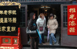 2007年春節(jié)期間,世界文化遺產(chǎn)地平遙古城推出“中國年”系列活動,吸引了大量外國游客前來感受晉商故里,體驗中國春節(jié)。圖為一家專營漆器(當(dāng)?shù)匾环N手工藝)的店鋪吸引了外國游客駐足。