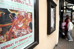 在英國海濱城市依斯特本,兩名英國小朋友隨家長走進(jìn)劇場觀看中國貴州歌舞團(tuán)的演出。(本報資料照片) |