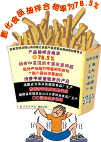 質(zhì)檢總局提醒消費者在購買膨化食品時要注意以下問題: 選購時應注意:1、選品牌。優(yōu)先在正規(guī)的大型商場、超市中購買知名品牌的產(chǎn)品。2、看標識。選購時最好選購有預包裝的產(chǎn)品并注意產(chǎn)品的標簽標識。因膨化食品油脂含量一般較高,如果保存不當,受高溫和高濕度的影響,易造成產(chǎn)品變質(zhì),所以在購買時特別注意產(chǎn)品的生產(chǎn)日期,選擇保質(zhì)期內(nèi)的產(chǎn)品,最好是近期生產(chǎn)的產(chǎn)品。 食用時應注意:1、品嘗感官。打開包裝聞一下產(chǎn)品的氣味是否正常,應沒有刺鼻的哈喇味,外觀沒有霉變,口感應松脆。2、不宜長期過多食用。長期大量食用此類食品會造成油脂、熱量大量攝入,易造成人體脂肪積累。3、對于糖類攝入不宜過多的人群或高血壓病人,應謹慎選擇此類食品。4、少年兒童正處于身體發(fā)育階段,更要注意合理膳食、均衡營養(yǎng)。如果在飯前大量進食此類食品,容易造成飽脹感,影響正常進餐,妨礙身體對營養(yǎng)物質(zhì)的吸收。 |