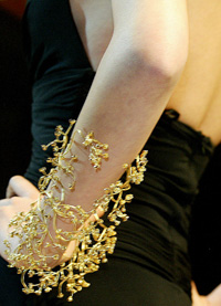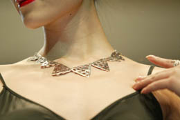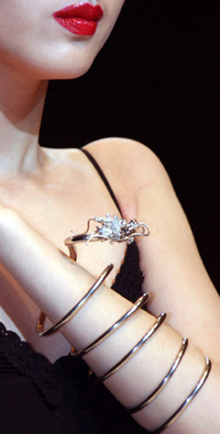 圖片說明:上海國際首飾時尚節(jié)上展出的珠寶首飾。依次為:蛇形鉑金手鐲、銀質(zhì)項鏈、金制工藝手鐲和工藝項鏈。(本報資料照片) |