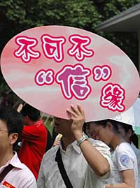 5月12日、13日在武漢東湖風(fēng)景區(qū)進(jìn)行的第二屆湖北青年相親文化節(jié)上,近10萬(wàn)人進(jìn)入會(huì)場(chǎng)。如果說(shuō)上世紀(jì)的父母之命、媒妁之言是一種封閉的“小農(nóng)經(jīng)濟(jì)”的話,那么,如今在武漢頻頻上演的“萬(wàn)人集體相親”卻堪稱一次“工業(yè)化的革命”。這一針對(duì)特定人群的“流水線”,批量制造愛(ài)情機(jī)遇,將婚戀過(guò)程瞬間提速。