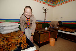“家庭旅館”大多是由一個(gè)家庭騰出幾間客房來(lái)出租經(jīng)營(yíng)的,游客可以與主人一起吃糌粑、喝酥油茶、聊家常。廣東的游客張女士說(shuō),拉薩的家庭旅館很有特色,住在這里可以更深刻地感受到西藏的特色!爱(dāng)然這里的價(jià)格比賓館酒店便宜也是其中一個(gè)原因!彼f(shuō)。