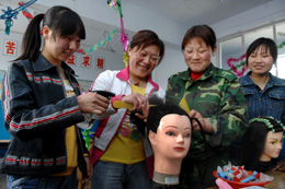 來自寧夏彭陽縣草廟鄉(xiāng)新洼村的趙粉琴(左二)正在向美發(fā)班的新同學(xué)傳授技能。